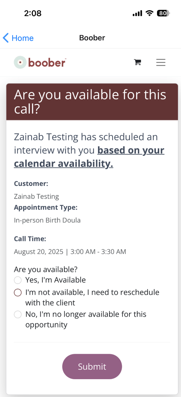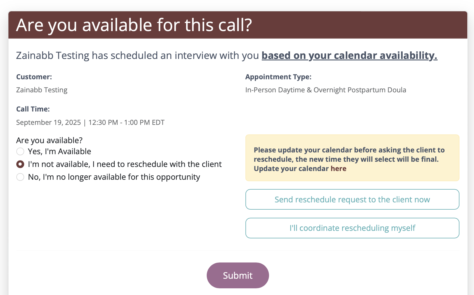 - If you are unavailable for the selected interview time and would like to schedule for a different time, select "I'm not available, I need to reschedule with the client"