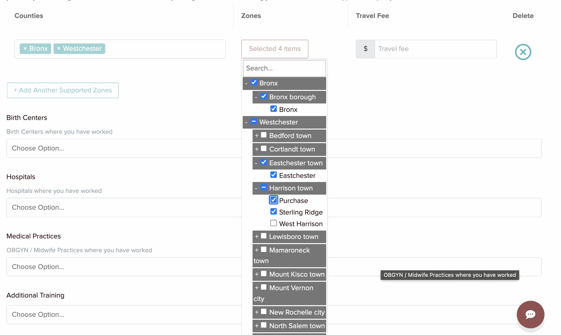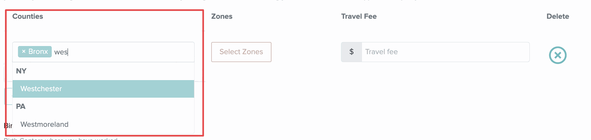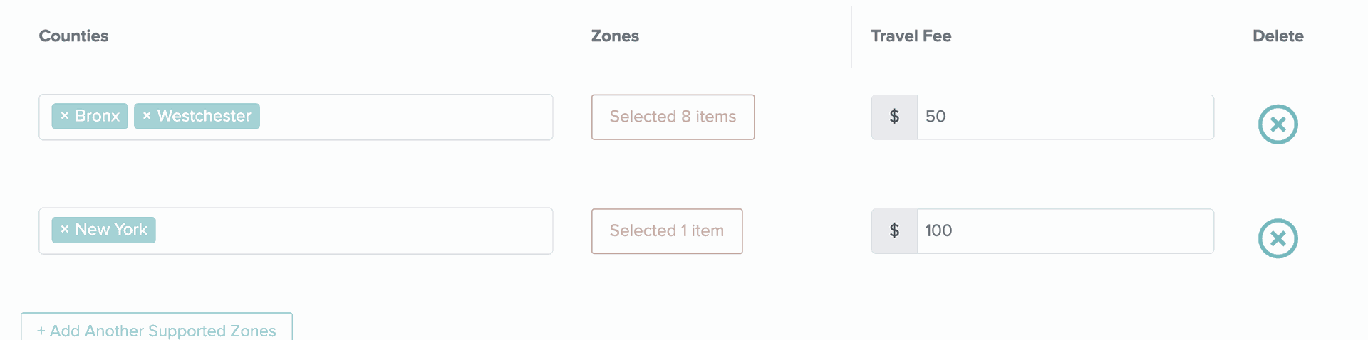 - A new row will appear with its own Counties, Zones, and Travel Fee fields.